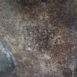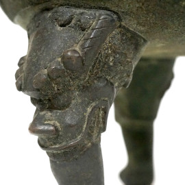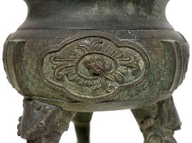 Bruciaprofumi in bronzo con decori incisi, cesellati e traforati, coperchio con presa a foggia di cane Fo, poggiante su quattro piedini decorati con teste di cane Fo, XIX-XX secolo, altezza cm 34 (difetti)