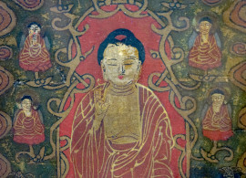 Buddha tra due bodhisattva e due committenti, Arte orientale, XIX-XX secolo, tempera su carta, cm 35x17, entro cornice