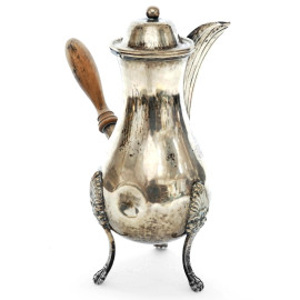 Caffettiera in argento con presa in legno, poggiante su tre piedini cesellati a foggia di zampa ferina, peso lordo gr. 550, altezza cm 23.5 (difetti)