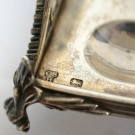 Calamaio in argento con decori cesellati e traforati poggiante su quattro piedini, Charles Stuart Harris, Londra, XIX-XX secolo, peso gr. 200, altezza cm 4x16x9