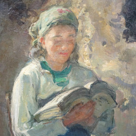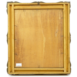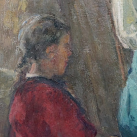 Interno con figure al focolare, olio su tavoletta, cm 60x50, firmato e datato "MCMXLVI" in basso a sinistra, entro cornice