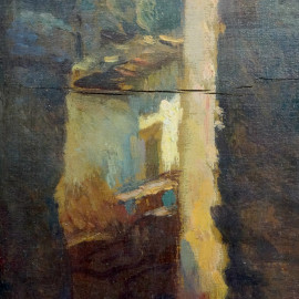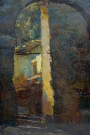 Scorcio di portico, olio su tavoletta, cm 24,5x17, firmato e datato "1947" in basso a sinistra, entro cornice