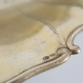 Centro tavola tondo di linea sagomata in argento su quattro piedini, A. Cesa S.C., XX secolo, peso gr. 335, cm 6,3x27,3