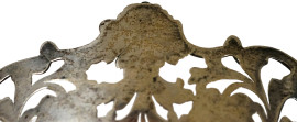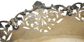 Centrotavola in argento con bordo mistilineo lavorato a cesello e traforato a motivi floreali, poggiante su tre piedini, peso gr. 760, diametro cm 33