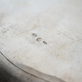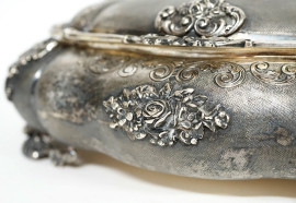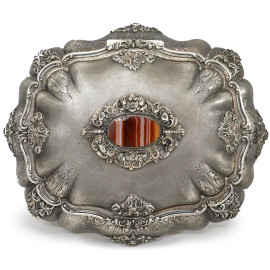 Cofanetto in argento baccellato, finemente lavorato a bulino, decorato con motivi vegetali a rilievo, inserto in pietra d'agata sul coperchio, Fassi Arno, anni '30, peso gr. 1430, cm 9x29x24