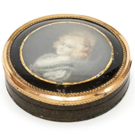 Cofanetto in bachelite con inserti in metallo dorato e miniatura, inizio sec. XX, alt. Cm 3, diam. Cm 9. (Difetti)