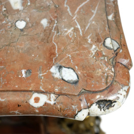 Comò Luigi XV a tre cassetti con piano in marmo, forma bombata, lastronata in bois the rose con guarnizioni in bronzo riccamente cesellate e dorate, poggiante su quattro gambe, cm 85,5x131x67