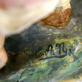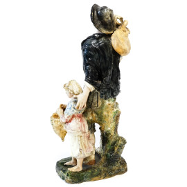 Contadino con bambina, ceramica policroma, firmata C.A.N. , cm 71,5x28x20 (difetti)