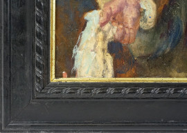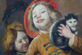 Copia da Judita Leyster (1609 – 1660), Due bambini che ridono con un gatto, XX secolo, olio su cartone, cm 50,5x39,5, entro cornice