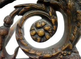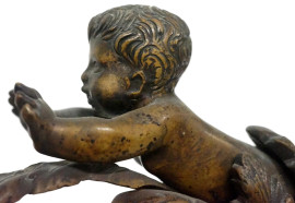 Coppia di alari in bronzo a volute vegetali e putti, XIX secolo, cm 33x25x41 (difetti)