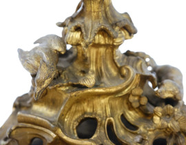 Coppia di candelabri a cinque luci in bronzo dorato montati a lampada, riccamente decorati con motivi vegetali e animali alla base, sec. XIX, cm 70x35. (Difetti)