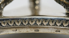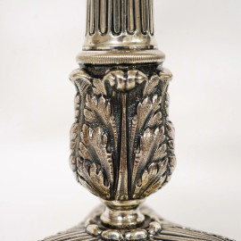 Coppia di candelabri a quattro fuochi in argento con decori a cesello, inizio XX secolo, peso gr. 2670, altezza cm 39