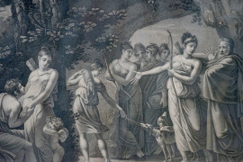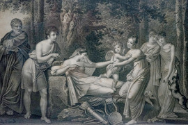 Coppia di incisioni : "Calipso jalouse d'Eucharis" e "L'Amour enflamme Calipso et Eucharis", sec. XIX, cm 45x59, entro cornice