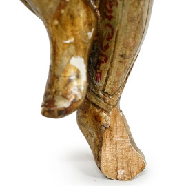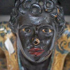 Coppia di mensole in legno intagliato e dipinto, sorrette da mori, XIX-XX secolo, cm 32x16,5x33 (difetti, mancanze)