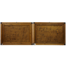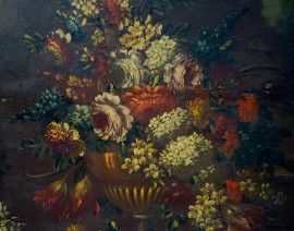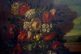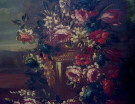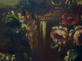 Coppia di nature morte di fiori entro un paesaggio, XX secolo, olio su tela, cm 75,5x109,5, entro cornice