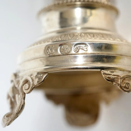 Coppia di porta stuzzicadenti in argento rappresentanti Arlecchino e Colombina, Regno lombardo-veneto, XIX secolo, peso gr. 280, altezza max cm 12,5