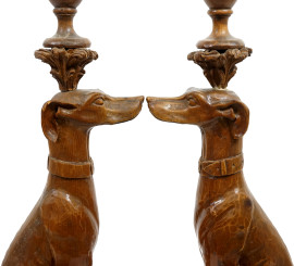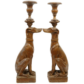 Coppia di portafiori in legno scolpito rappresentanti due levrieri seduti su un cuscino, XX secolo, cm 83x19,5x21,5