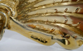 Coppia di salsiere e coppia di cucchiaini in argento a foggia di conchiglia con interno in argento vermeil, sec. XX, gr.260, max cm 2x14,5x12,5