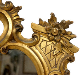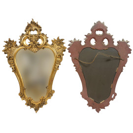 Coppia di specchiere in legno dorato e intagliato a riccioli vegetali e fiori, sec. XX, cm 97x66,5, (difetti)
