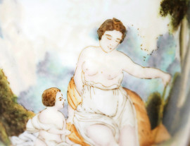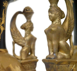 Coppia di vasi biansati stile impero in ceramica oro, porpora e nero, con scene policrome e sfingi a sormontare le anse, base in marmo nero, sec. XX, alt. cm 47, (difetti)