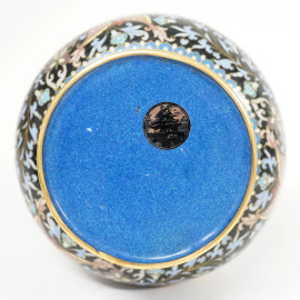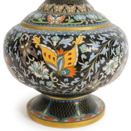 Coppia di vasi cloisonné con rifiniture dorate e decori in smalti policromi con farfalle, motivi geometrici e floreali, Cina, sec. XX, alt. cm 26, (difetti)