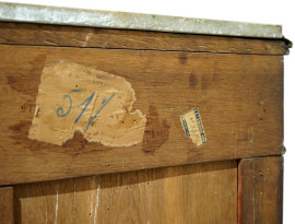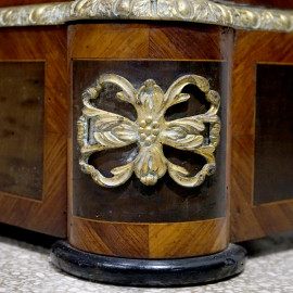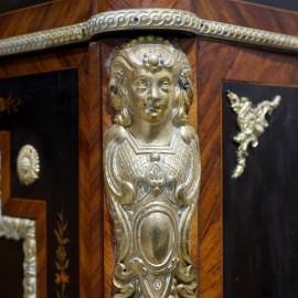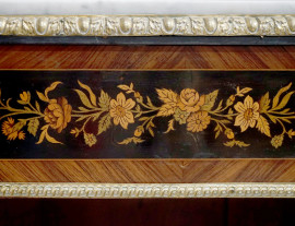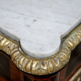 Credenza a due sportelli in legno intarsiato, piano in marmo e finiture in bronzo dorato. Intarsi a motivi floreali e interno a tre ripiani, sec. XIX, cm 130x45x110. (Difetti)