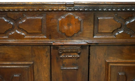 Credenza in legno di noce intagliato, a doppia anta e interno a doppio ripiano, con piano bipartito apribile, XVIII secolo, cm 113,5x216x52, (difetti)