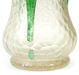 Due vasetti "Martelè" in vetro iridescente con decoro verde applicato e bordo, Wilhelm Kralik, inizio XX secolo, altezza max cm 18,5 (difetti e rotture)