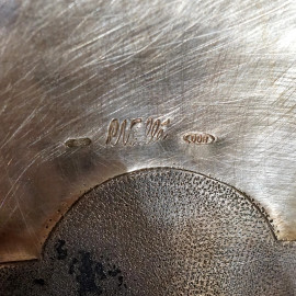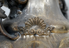corpo baccellato con decori incisi sblalzati e cesellati a motivi floreali, anse a volute fogliacee, bocca smerlata, base circolare.