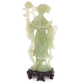 Guanin in gadeite su piedistallo in legno, XX secolo, altezza cm 18,5