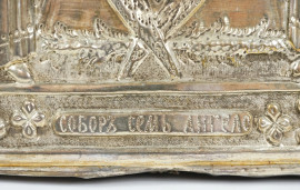 Icona con Bambino, Vergine e Angeli, tempera su tavola con riza in metallo, Russia, sec. XIX-XX, cm 31x26, (difetti)