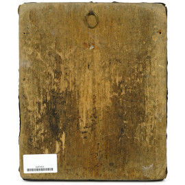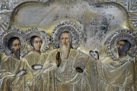Icona russa raffigurante quattro Santi con riza in metallo argentato cesellato e sbalzato, XIX secolo, cm 31x26, (difetti)