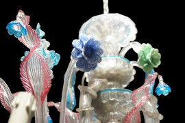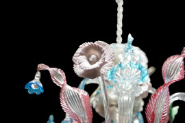 Lampadario in vetro di Murano in vari colori a nove luci, elementi decorativi a foggia di foglie e fiori, XX secolo, cm 95x95 circa