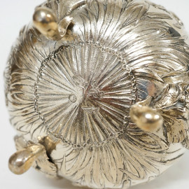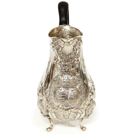 Lattiera in argento con manico in legno, riccamente decorata a cesello con motivi floreali e a volute, poggiante su tre piedini, Parigi, XVIII secolo, peso gr. 378, altezza cm 17 (difetti e mancanze)