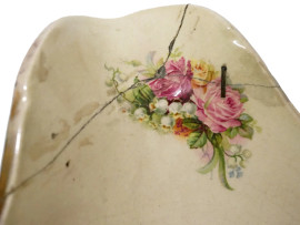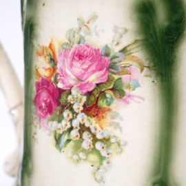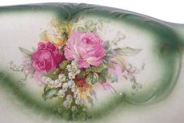 Lavabo con versatoio in ceramica policroma con decori floreali, XX secolo, misura max cm 37x50x38,5 (difetti)