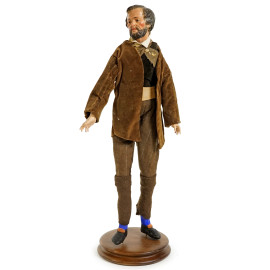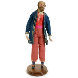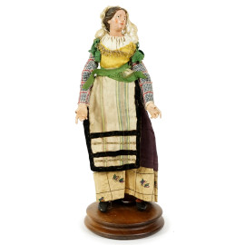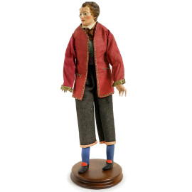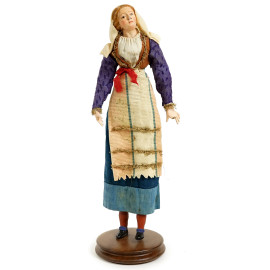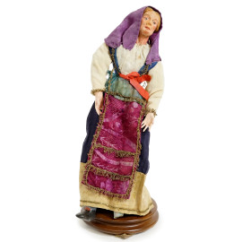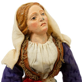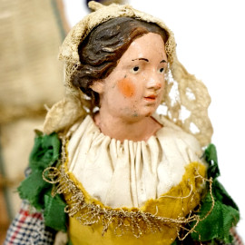Lotto composto da 7 sculture in terracotta policroma e stoffa (alcune con occhi in vetro) raffiguranti personaggi da presepe, con basi circolari in legno, XX secolo, altezza max cm 43, entro teche in legno e vetro, misura max cm 51,5x19x19 (difetti e rotture)