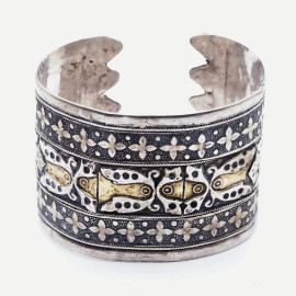 Lotto composto da due bracciali rigidi in argento con particolari dorati e in smalto, peso gr. 59,4 (difetti)