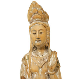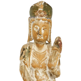 Lotto composto da due Guanin in legno scolpito e dipinto con tracce di policromia, altezza max 41,5 (difetti)
