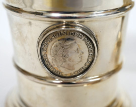 Lotto composto da un bicchiere e una coppetta in argento sbalzata e cesellata, XX secolo, peso gr. 440, altezza max cm 13