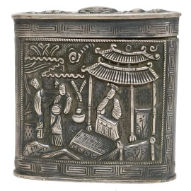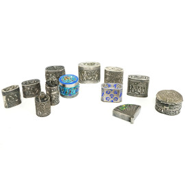 Lotto di 12 scatoline cinesi in argento sbalzato, cesellato e traforato e smalto, sec. XIX-XX, peso gr. 960, misura max cm 5x5,5 (difetti)