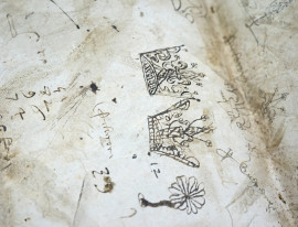 Lotto di tre coperte in pergamena di antichi registri del XV secolo, cm 33x25,5 circa