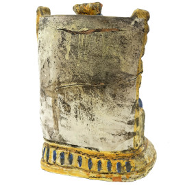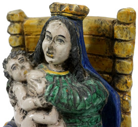 Madonna con il Bambino in trono, ceramica policroma, XX secolo, cm 27,5x19,14,5 (difetti)