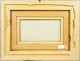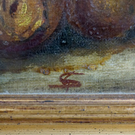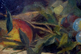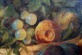 Natura morta con frutta, olio su tela applicata su cartone, XIX-XX secolo, siglato in basso a destra, cm 24,5x43, entro cornice
