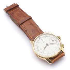 Nicolet Watch, cronografo da polso in oro 18 KT, anni '50, quadrante diametro cm 4, lunghezza cm 23,5, (difetti, meccanismo da revisionare)