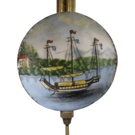 Orologio "a tempietto" circolare in marmo e bronzo , quadrante in porcellana fianceggiato da tre colonne scanalate per lato, pendolo in ceramica dipinta raffigurante un veliero, sec. XIX-XX, alt. cm 40, diam. cm 19, (difetti, meccanismo da revisionare)