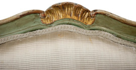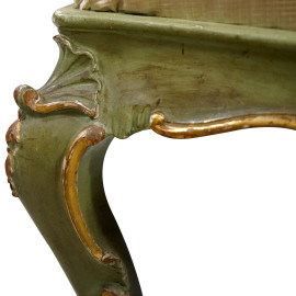 Otto sedie in legno laccato verde con finiture dorate su quattro gambe mosse, sec. XX secolo, cm 102x52x50 (Difetti)