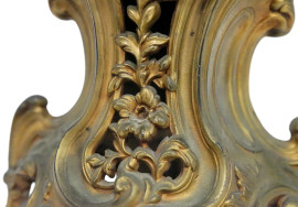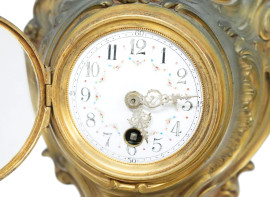 Pendola da tavolo in bronzo a volute e riccioli, quadrante in ceramica, sec. XX, alt. cm 40