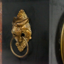 Pendola da tavolo in marmo nero di Belgio e rosso, con piedi anteriori leonini bronzei, teste leonine bronzee ai lati, sec. XIX-XX, cm 23,5x24,5x13,5, (difetti, meccanismo da revisionare)