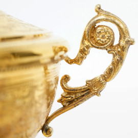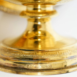 Piattino e zuccheriera in argento vermeil decorata a fregi continui a festoni con anse a volute vegetali e conperchio con presa a foggia di ghianda, XX secolo, peso gr. 590, altezza cm 15,5