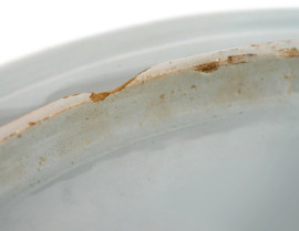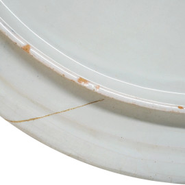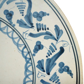 Piatto piano tondo in maiolica dipinta a decori vegetali nei toni del bianco e del blu, sec. XIX, diam. cm 35,5, (difetti)